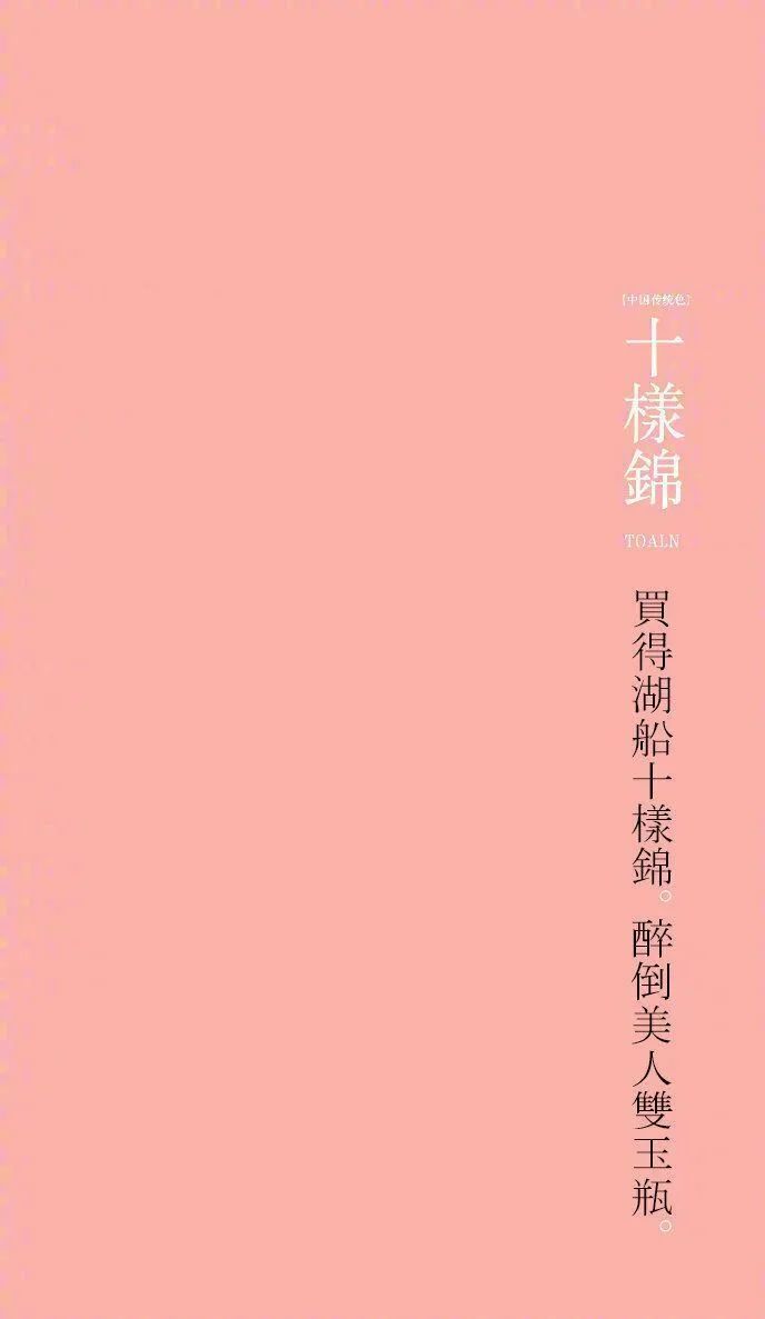 梅染、荼白、落栗、薄柿、酡颜、踯躅、曙色、缁色、鸦青、胭脂、若草、缟、缃色、竹青、苏芳、缥色、天水碧、月白、远山如黛、青梅煮酒、桥下春波…